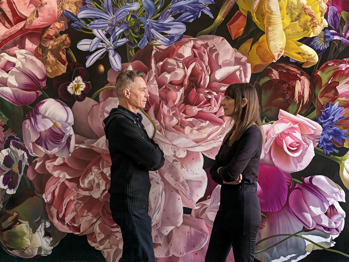 Das in Mailand lebende und arbeitende Künstlerduo CASAGRANDE & RECALCATI fühlt sich der Tradition des Stilllebens verbunden. Die den Titel Hypervanitas tragenden Blumenbilder greifen die Idee der barocken Vanitas Bilder, und ihre enge Verbundenheit mit dem Flüchtigen, auf. Bei den Bildern handelt es sich um Reflexionen über die unaufhaltsam verrinnende Zeit, visualisiert werden verschiedene Stadien der Schönheit in kontinuierlicher Metamorphose. Das Künstlerduo, das für Dolce & Gabbana gearbeitet hat, zelebriert in den Bildern gekonnt Schönheit, Materialität und Vergänglichkeit. Die neuesten in Öl auf Leinwand gemalten Arbeiten zeigen üppige, florale Kompositionen, die bei genauem Hinsehen schon langsam zu verwelken scheinen. Die Bilder des Künstlerduos entführen uns in einen imaginären Garten Eden, der einer langsamen Degradation unterliegt. Nicht nur eine üppige Flora, auch einzelne Tiere sind in das Bild integriert. Hier zeigt sich die Natur in morbider Schönheit, alles ist vergänglich und wird dank der minuziösen Malerei konserviert.