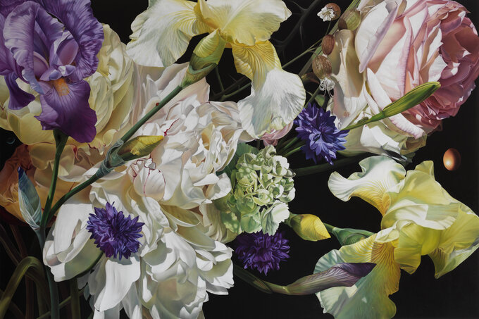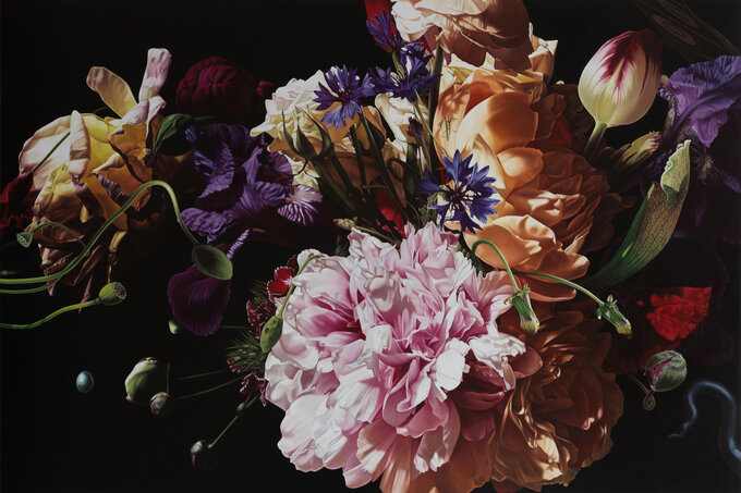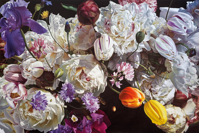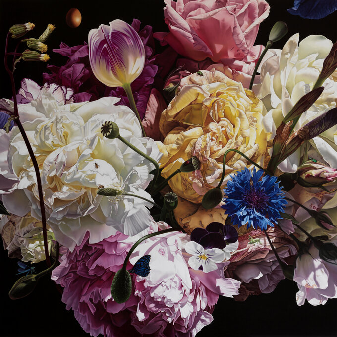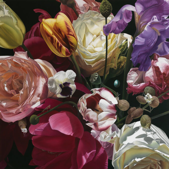 Das in Mailand lebende und arbeitende Künstlerduo CASAGRANDE & RECALCATI fühlt sich der Tradition des Stilllebens verbunden. Die den Titel Hypervanitas tragenden Blumenbilder greifen die Idee der barocken Vanitas Bilder, und ihre enge Verbundenheit mit dem Flüchtigen, auf. Bei den Bildern handelt es sich um Reflexionen über die unaufhaltsam verrinnende Zeit, visualisiert werden verschiedene Stadien der Schönheit in kontinuierlicher Metamorphose. Das Künstlerduo, das beispielsweise schon für Dolce & Gabbana gearbeitet hat, zelebriert in den Bildern gekonnt Schönheit, Materialität und Vergänglichkeit. Die neuesten in Öl auf Leinwand gemalten Arbeiten zeigen üppige, florale Kompositionen, die bei genauem Hinsehen schon langsam zu verwelken scheinen. Die Bilder des Künstlerduos entführen uns in einen imaginären Garten Eden, der einer langsamen Degradation unterliegt. Nicht nur eine üppige Flora, auch einzelne Tiere sind in das Bild integriert. Hier zeigt sich die Natur in morbider Schönheit, alles ist vergänglich und wird dank der minuziösen Malerei konserviert.