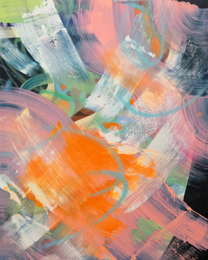 Durch die bewusste Pinselführung und die präzise Farbwahl entstehen intensive Farbwelten, die den Betrachter*innen unterschiedliche Ebenen der Sinnlichkeit aufzeigen. Die Werke der drei Künstler*innen treten in einen Dialog, um in einen Fluss aus Bewegung und expressiven Pinselstrichen zu münden. Dabei verschmelzen die einzigartigen künstlerischen Handschriften der drei Positionen zu einem faszinierenden Zusammenspiel von Farbe und Gestik. Sie laden die Besucher*innen ein, sich in den organischen Flächen und schwungvollen Linien der Werke zu verlieren und die subtilen Spannungen zwischen Chaos und Harmonie zu erleben.