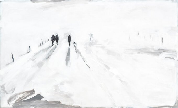 In diesen Kompositionen wird das Weiß zum eigentlichen Protagonisten. Es ist kein leerer Hintergrund, sondern eine pulsierende und weite Fläche, die jede Bewegung sowie jede Setzung ungeschützt offenlegt. Was in diesem Raum verbleibt, hat die Prüfung der Reduktion bestanden. Skurskis Figuren, oft im Warten oder im Übergang begriffen, verkörpern keine bloßen Handlungen, sondern eine stille und existenzielle Präsenz. Indem die Gesichter zugunsten der Körperhaltung zurücktreten, wird der Blick frei für ein Sein, das über das Individuelle hinausgeht.