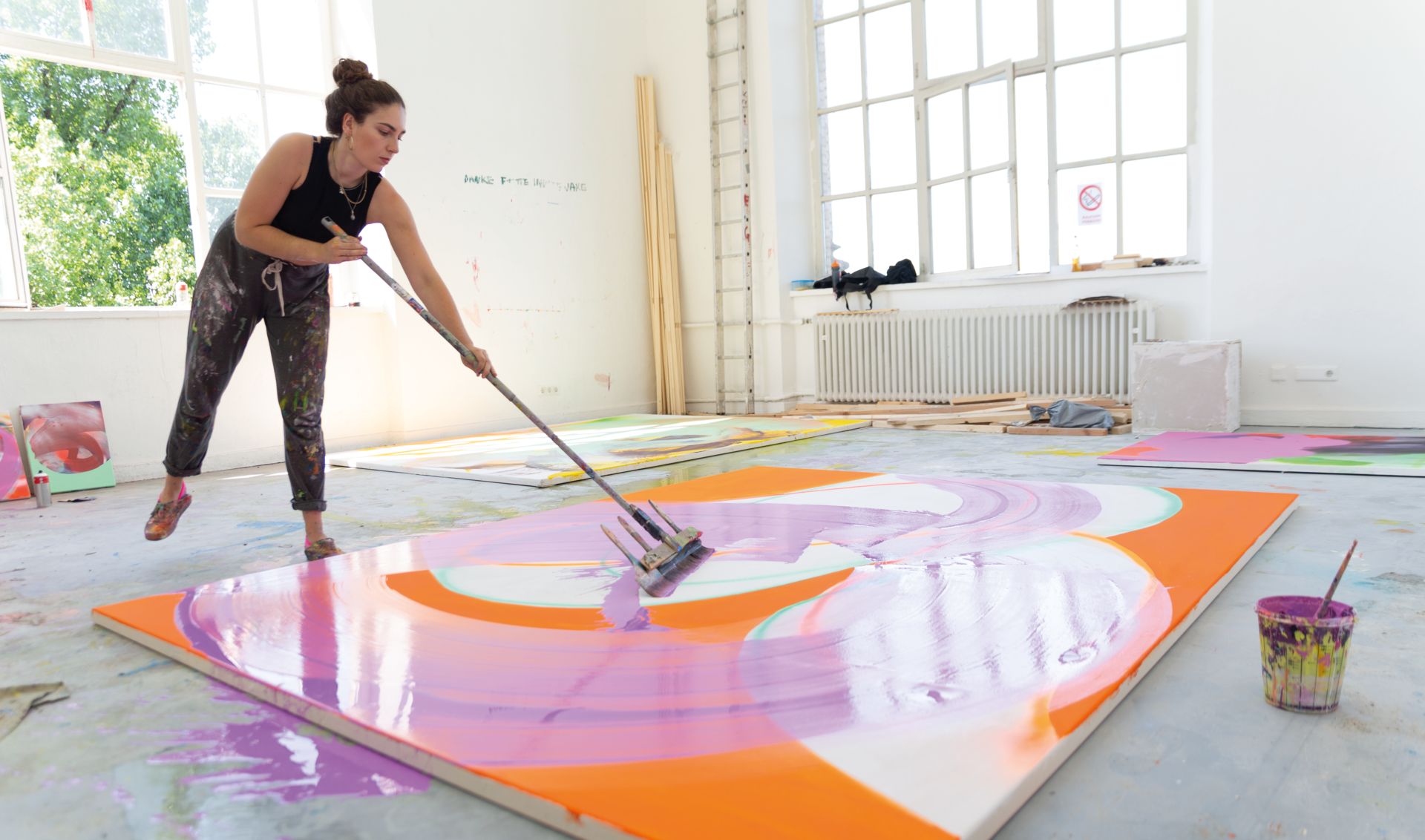 Die Bilder der in Düsseldorf lebenden und arbeitenden Künstlerin Laura Aberham definieren sich über ihre Farbintensität und eine unglaubliche Dynamik. Ihr Umgang mit Farbe und Form ist souverän und äußerst kraftvoll, ihre meist großformatigen, abstrakten Arbeiten wirken gestisch und gleichsam präzise komponiert. Laura Aberhams Malerei ist eine Hommage an die Farbe. Mit gestischen, voluminösen Pinselstrichen bringt sie in vielen Schichten ungewöhnliche Farbkonstellationen gekonnt auf die Leinwand, hier wird die Farbe selbst zum Konzept. Die Künstlerin, die an der Kunstakademie in Düsseldorf als Meisterschülerin bei Ellen Gallagher abgeschlossen hat, hat durch ihren sehr physischen Umgang mit Farbe eine ganz eigene Handschrift gefunden. Zu Beginn ihres Studiums besuchte sie die Skulpturenklasse, sie hat hier das Volumen und die Dynamik verinnerlicht, die Erfahrungen von Struktur, Form und Raum wendet sie in ihrer Malerei überzeugend an. Laura Aberhams Arbeiten scheinen sich, bedingt durch ihre Räumlichkeit und körperliche Dynamik, über den Bildrand hinaus fortzusetzen.